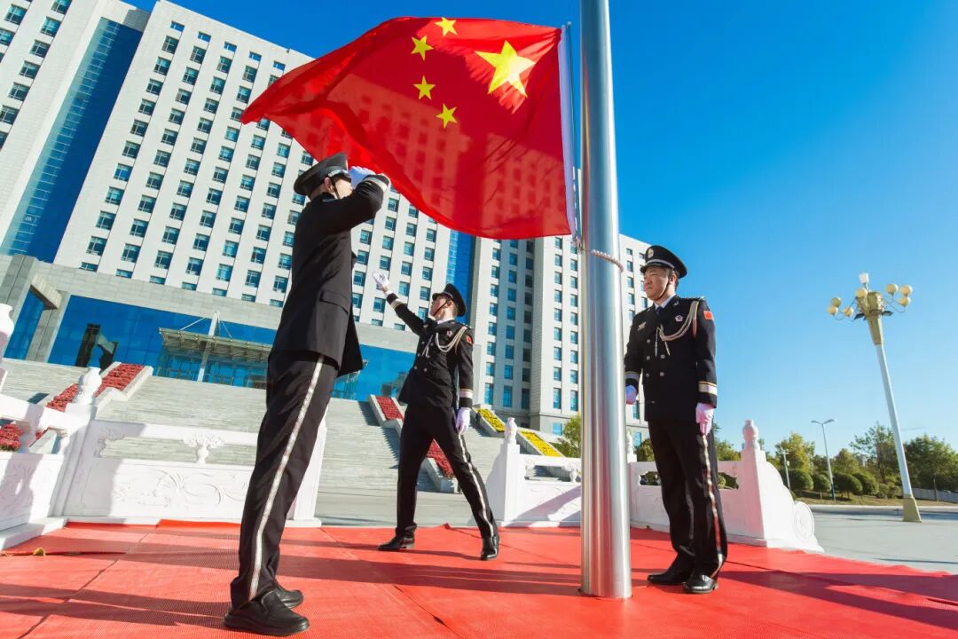8时30分,升国旗仪式正式开始。由青年民警组成的国旗护卫队迈着铿锵有力、整齐划一的步伐,护卫中华人民共和国国旗行至旗杆前。