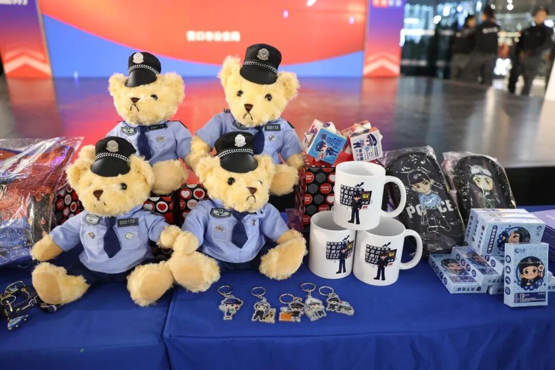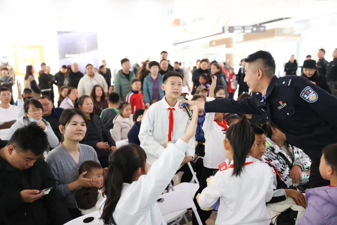 现场还设置了有奖问答与合影互动环节。主持人提出公安法治相关问题,观众踊跃参与,气氛热烈。回答正确的观众获得了马克杯、警察小熊、定制毛巾等精美礼品。宣传展板与警用主题拍照立牌也吸引众多群众驻足打卡。活动共发放宣传资料850余份,在轻松愉快的氛围中传递法律知识,凝聚警民同心正能量。