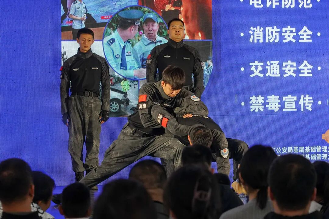 随后,鲅鱼圈区公安局巡特警大队海鹰特战队闪亮登场。队员们警容严整、英姿勃发,在激昂的配乐中展开擒拿格斗等警务技能演示。动作干净利落、气势如虹,展现了营口公安过硬的实战能力,赢得观众阵阵掌声与欢呼。