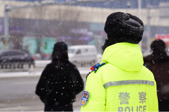 寒风裹挟着雪花扑面而来,很快便落满了执勤民警辅警的帽檐与肩头,手套和鞋袜也早已被雪水浸透。但他们身姿依然挺拔,手势依旧标准——疏导车流、提醒减速、引导保持车距……每一个细节都为群众筑牢安全防线。遇到车辆打滑、起步困难,他们主动上前推车,帮助安装防滑链;发生轻微剐蹭事故,他们快速处置、快撤现场,最大限度减少拥堵,及时消除安全隐患。