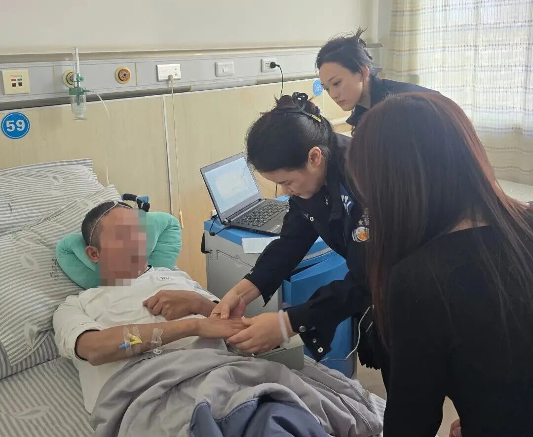 鲅鱼圈区公安局港南派出所民警手持移动指纹采集设备走进病房,为重病患者现场办理手续。移动警务设备将窗口“搬”到病床前,采集指纹的同时,也把温暖送到了群众心坎里。